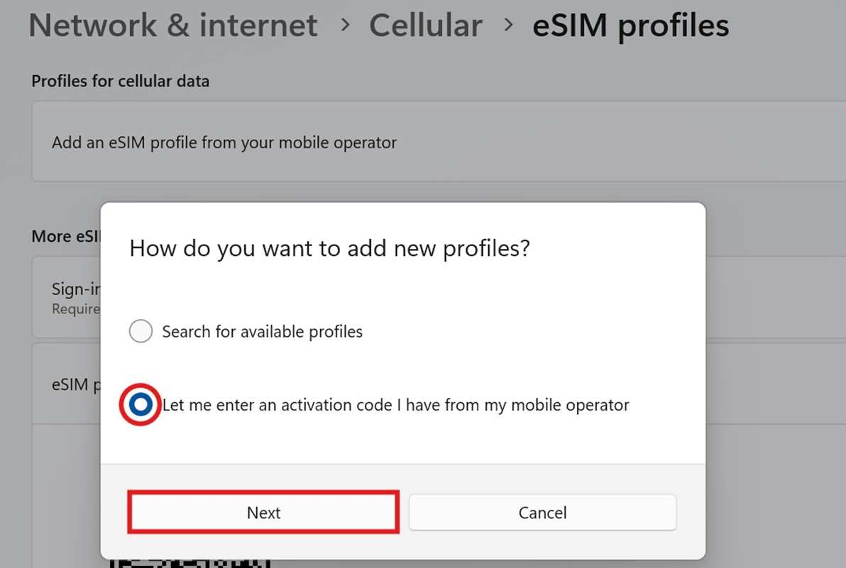 7. During this process you will need to use your phone or another device to show the QR code to your notebook’s web cam. You can also print the QR code. The notebook webcam will automatically scan the QR code and request your confirmation to start the eSIM profile download.